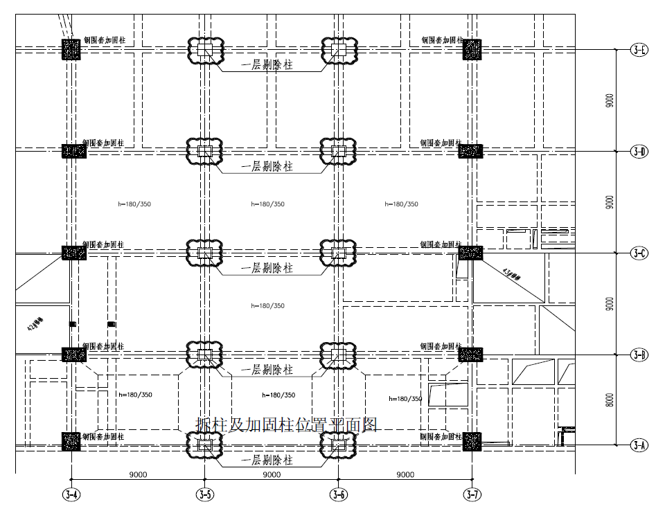 1、根據建築設計要求,抽柱10根,原結構9mx9m單跨空間變成27mx36m的大空間。10根柱爲裙房首層連續結構框架柱,裙房6層,地下(xià)3層。