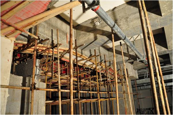 本工程地下(xià)室梁柱需大面積進行加固改造施工,總澆築量1500多噸,施工工期僅爲45天,本工程需對柱子、梁進行截面加大施工,加大截面尺寸基本均爲100mm,施工難度比較大。經研究采用特種加固混凝土進行加固處理,施工過程采用小型泵送系統加快施工進度同時解決了現(xiàn)場無法澆築的施工難題。